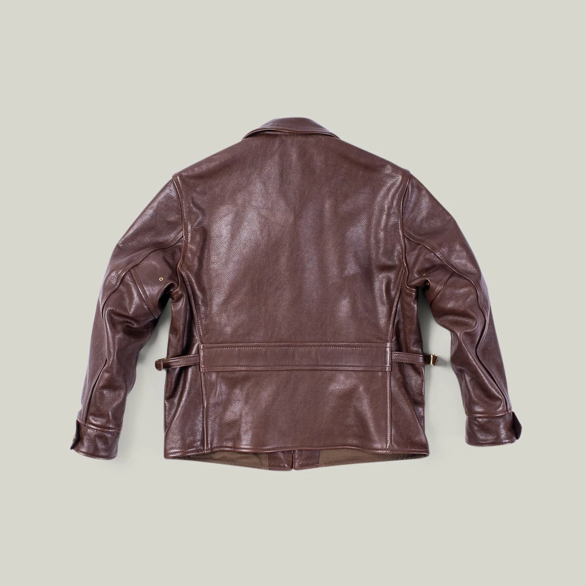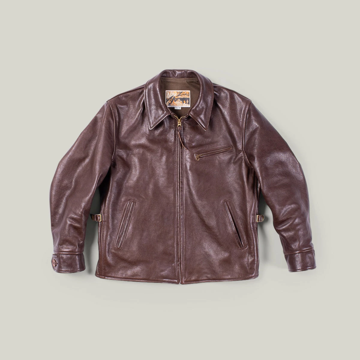 The Plainsman Jacet from Aero Leather Clothing is based on their popular Dustbowl design, but with a more simple back and extra length to make it more accessible for those not wanting the shorter, pre-war, look. This example has been produced in a beautiful seal brown Italian vegetable tanned Vicenza leather with classic olive drill lining. In the interests of providing a range of sizes for our customers to try on in store, this one is customised to fit a size 40 chest and height of 5’4″.