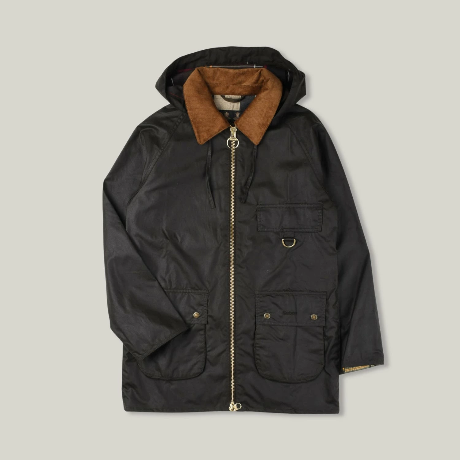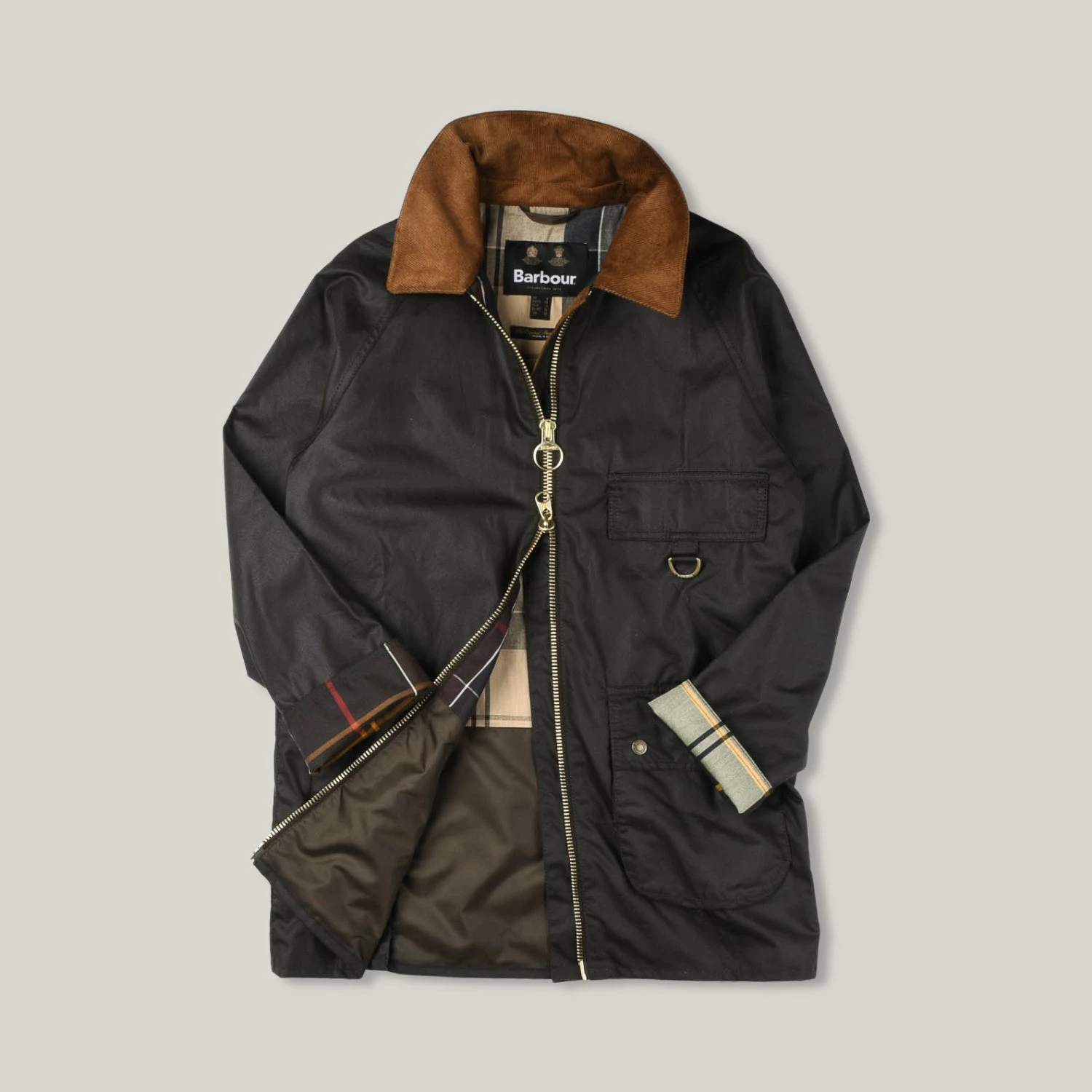 A new ladies jacket that uses elements of classic Barbour and uses their famous 6oz Sylkoil waxed cotton. Part hiking jacket in shape, with raglan sleeve and large front pockets, it has the back buttoned detail, contrasting corduroy collar, double zip, hood and signature tartan lining. Further details include d-ring on front for hanging your wares off.