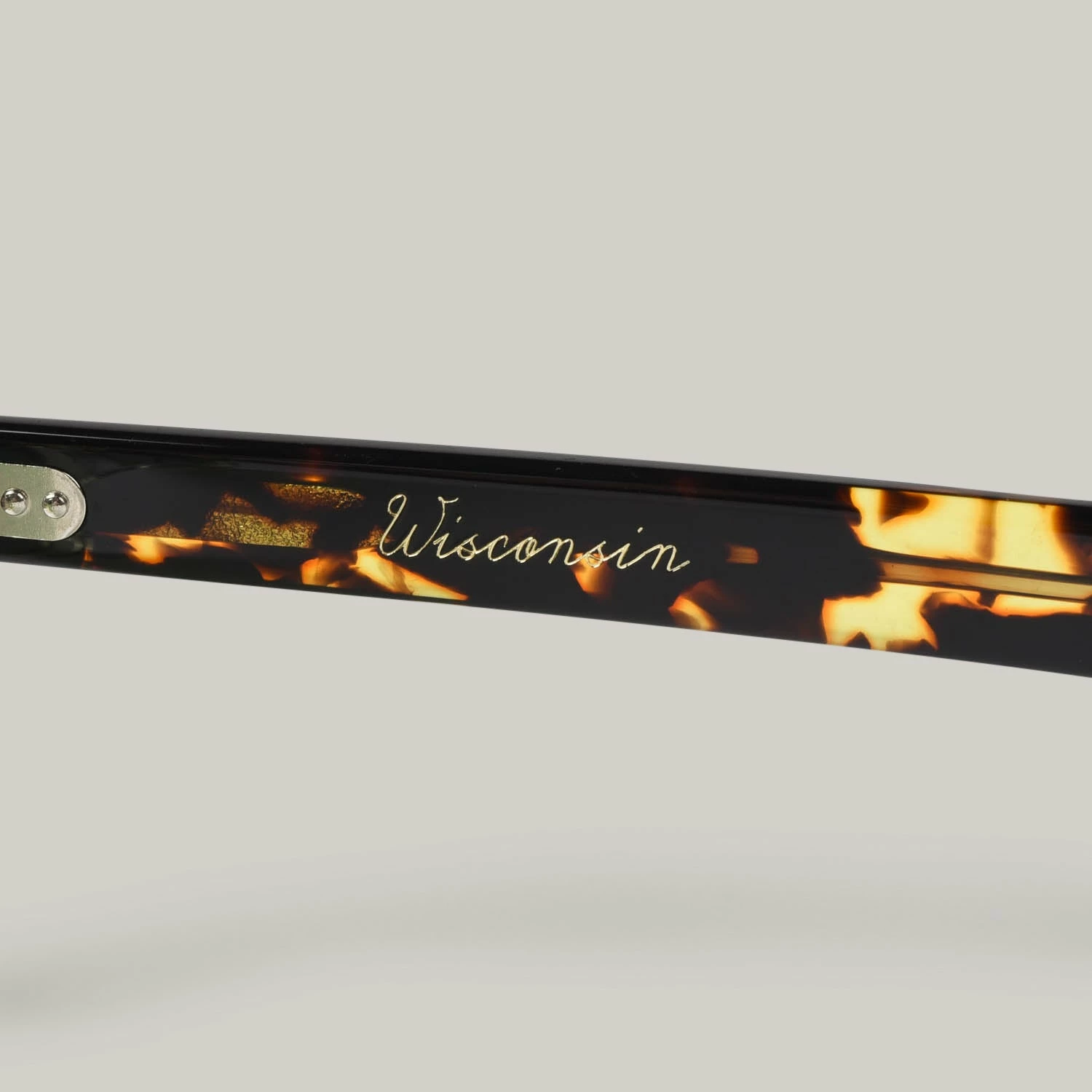 Continuing his university range of frames, the Wisconsin is inspired by this eponymous place of learning that was established in Madison in 1849. A 1960’s bookish model, it incorporates three distinguishing temple studs, an ecru frame and amber tortoiseshell arms to elevate it from the norm.