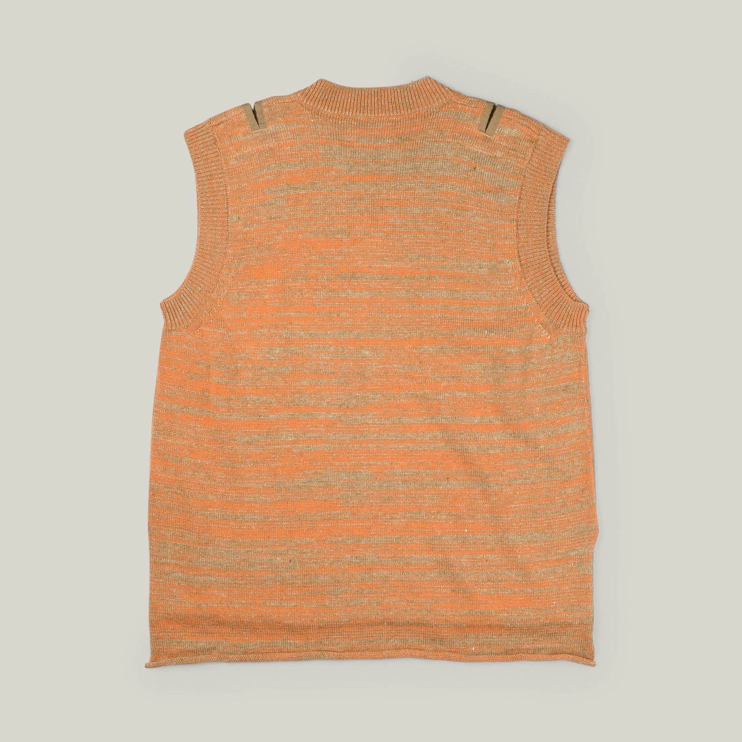 A tangerine dream of a vest, made in a linen-heavy melange knit, to keep you breezy yet warm in hotter times. Details include raw edge bottom with side slits and epaulette details on the shoulders as a nod to its military origin.