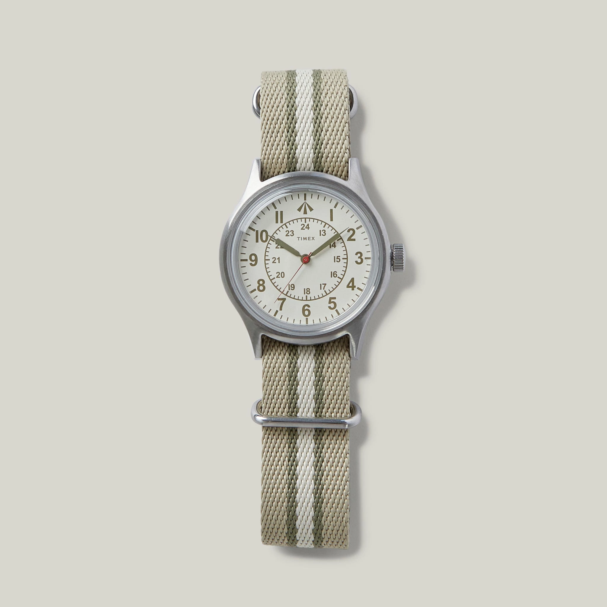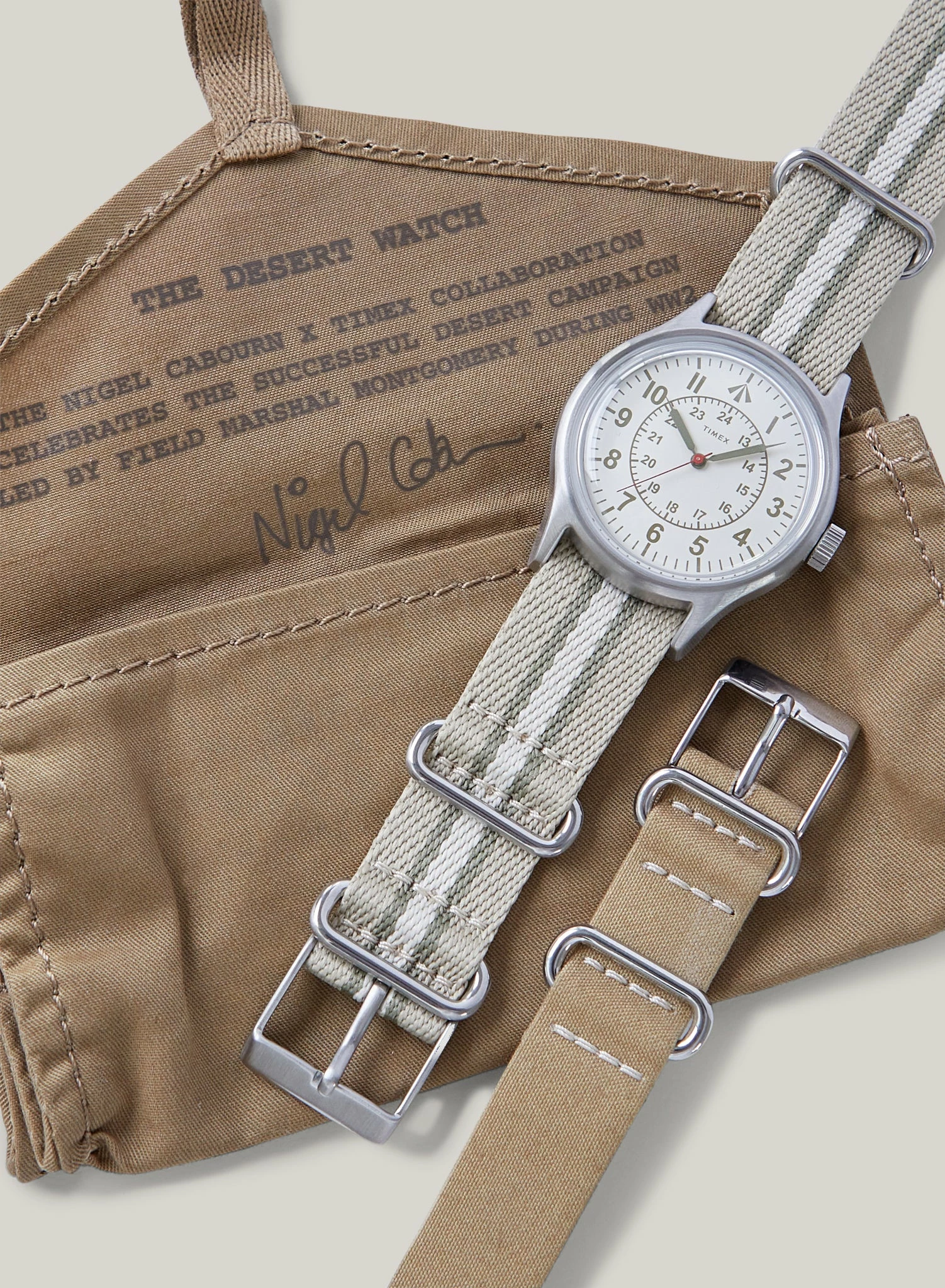Introducing the fifth and possibly last collaboration between British menswear designer Nigel Cabourn and iconic watchmakers Timex. Teaming up with the brand once again to deliver you the Desert Watch, the next iteration in a long-standing line of military inspired timepieces. The Desert Watch draws inspiration from the World War II era while providing the design and functionality to withstand any situation.