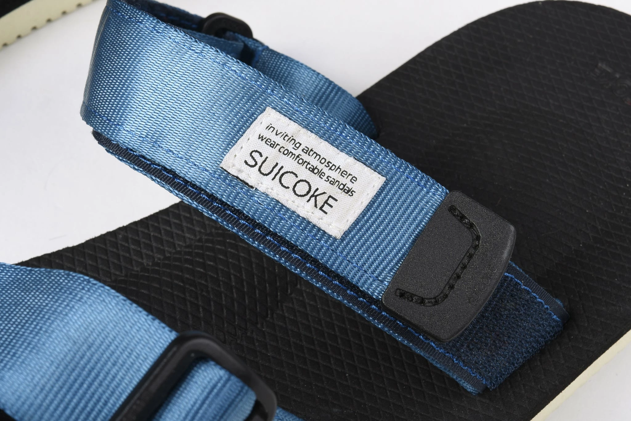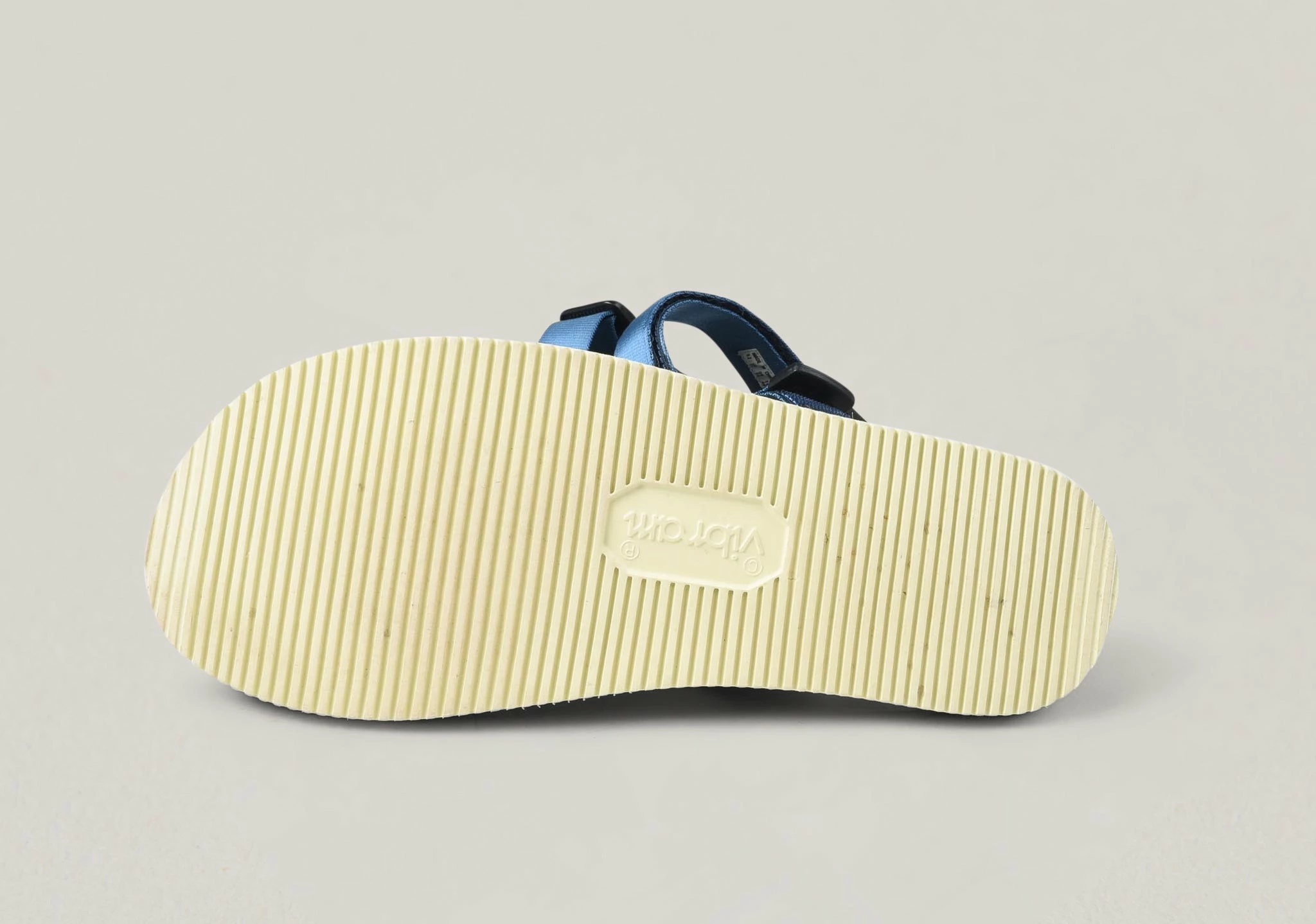 Triple strap sandals from Japanese sandals titans Suicoke. These simple sandals have a black and white sole with sky blue straps to secure.